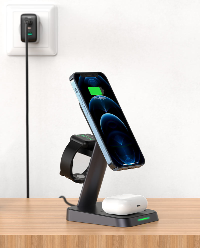 MagSafe Vezeték nélküli töltő telefonhoz, TWS headsethez, okosórához. Asztali állvány. 5W / 7,5W / 10W / 15W kimenet. Előlap kettős vezeték nélküli töltőtekerccsel. Vízszintes és függőleges töltés. Többszörös tanúsítás. Ergonomikus hajlított kialakítás.